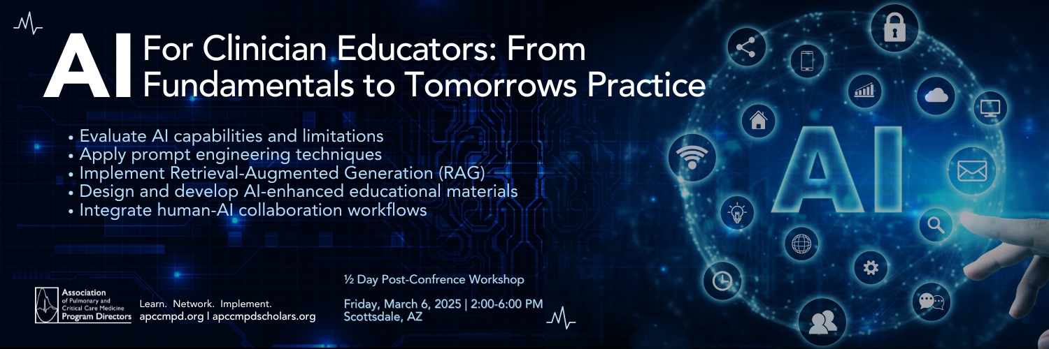This comprehensive course equips clinician educators with essential knowledge and practical skills to effectively integrate artificial intelligence into medical education. Participants will progress from foundational AI concepts—including capabilities, limitations, and ethical considerations—to advanced techniques like Retrieval-Augmented Generation (RAG) and precision education through AI-powered simulations. Through hands-on applications and real-world case studies, educators will learn to leverage large language models responsibly, create high-quality educational content, and design personalized learning experiences that enhance teaching effectiveness while maintaining academic rigor and patient safety standards.